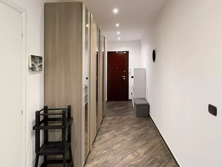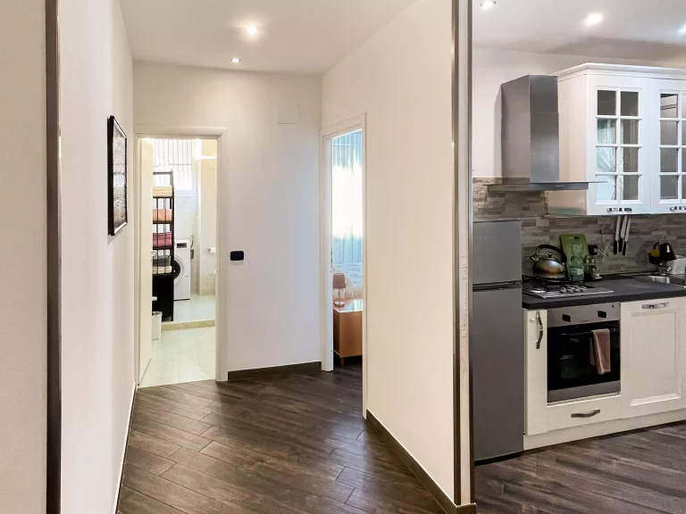 L’appartamento è composto da un ampio ingresso, salone doppio con cucina a vista e divano letto, disimpegno, bagno con doccia e lavatrice, e camera con letto matrimoniale. È possibile aggiungere un letto singolo per un quinto ospite. Dispone di due condizionatori, riscaldamento autonomo, TV a schermo piatto con canali satellitari e WiFi gratuito. La cucina è completamente attrezzata con frigorifero, lavastoviglie, microonde, macchina da caffè, frullatore e crepiera elettrica.